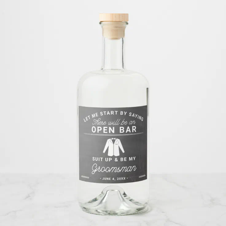 Amazon.com: Groomsmen Bottle Labels Suit Up Groomsmen Proposal Gold and Silver Foil Stamped Bottle Stickers - 1 Best Man Label and 6 Groomsmen Labels, Will You Be My Groomsman Proposal Gift Set, Waterproof (7 Piece) 4.7 (197) $1299 FREE delivery Sat, Mar 11 on $25 of items shipped by Amazon Or fastest delivery Fri, Mar 10 Only 1 left in stock - order soon. Small Business 6 Will You Be My Groomsman + 1 BONUS Best Man Proposal Wine Labels or ... Why order our Suit Up Groomsman & Best Man Proposal bottle labels? ️ Waterproof & Durable wine label stickers or liquor stickers ️ Gold and Silver Foil Stamping!!! ️ Perfect Groomsmen gifts ideas. Perfect Best Man gifts Ideas ️ Plenty of room left on the label for customization (added names, dates, ect.) ️ Impress your Bridesmaids and Groomsman with your taste in creative proposal ...