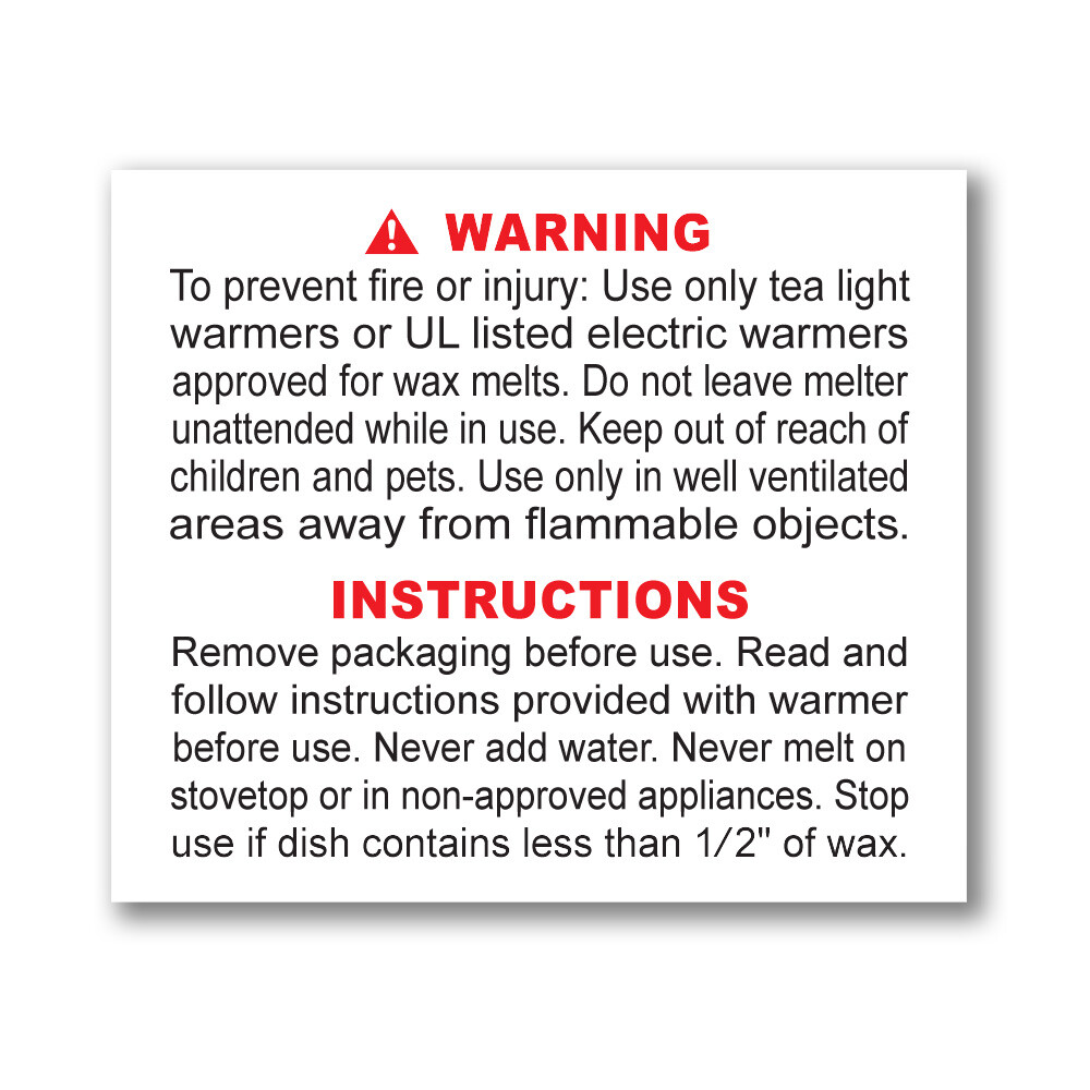 MILIVIXAY 500 Pieces Wax Melt Warning Labels Candle Warning Labels Wax ... MILIVIXAY 500 Pieces Wax Melt Warning Labels Candle Warning Labels Wax Melt Warning Labels for Clamshell, 1.8 x 1.5 inches . Visit the MILIVIXAY Store. 4.8 out of 5 stars 104 ratings. Amazon's Choice highlights highly rated, well-priced products available to ship immediately.