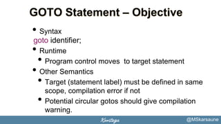 Go Goto - javatpoint The Go goto statement is a jump statement which is used to transfer the control to other parts of the program. In goto statement, there must be a label. We use label to transfer the control of the program. Go Goto Statement Example: package main import ( "fmt" ) func main () { var input int Loop: fmt.Print ("You are not eligible to vote ") Goto Statement In Java | PrepInsta Instead of Goto function, Java uses Label. Labels are used to change the flow of the program and jump to a specific instruction or label based on a condition. Use of Break And Continue in Label: Break and continue are used to break or to continue the program when the label function is called. How can I use goto in Javascript? - Stack Overflow There is a project called Summer of Goto that allows you use JavaScript at its fullest potential and will revolutionize the way you can write your code. This JavaScript preprocessing tool allows you to create a label and then goto it using this syntax: [lbl] goto dsl - How GOTO statement in Groovy? - Stack Overflow label1: a (); b (); goto label1; PS: I don't prefer the discussion if I should really use/want the GOTO statement. The DSL is a specification-language and is probably not coping with variables, efficiency etc. PS2: Some other keyword then GOTO can be used. groovy dsl transformation goto continuations Share Improve this question Follow